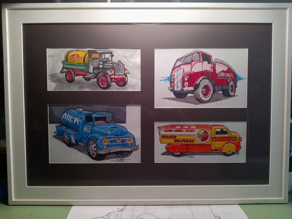 Collection of antique toy trucks done in 4-different medias: Watercolor, Acrylic, Magic Marker and airbrush.