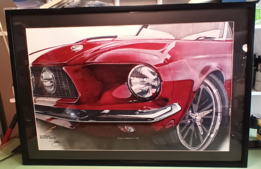 1967 Shelby GT 500 Mustang on 36′ x 24′ Bristol Board in mixed-media from cell phone image. April 2023